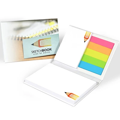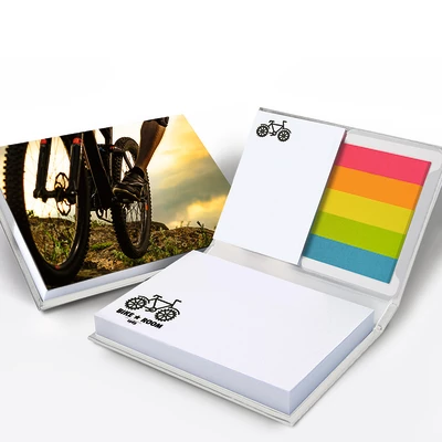 Hardcoverset mit unterschiedlichen Bestandteilen: Zwei Haftnotizen, ein Notizblock und vier individualisiebare Papiermarker. Optional mit Stifthalterung aus Karton.