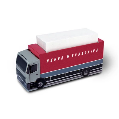 Für jede Spedition eine gelungene Werbung: Unsere Kartonbox in LKW-Form mit Zettelsatz. In Ihrem Corporate Design individualisierbar.